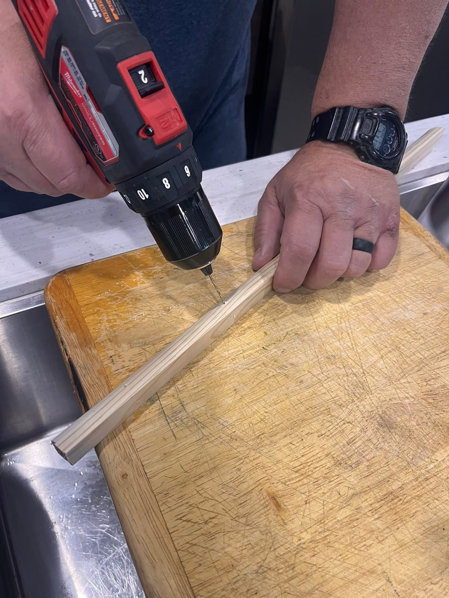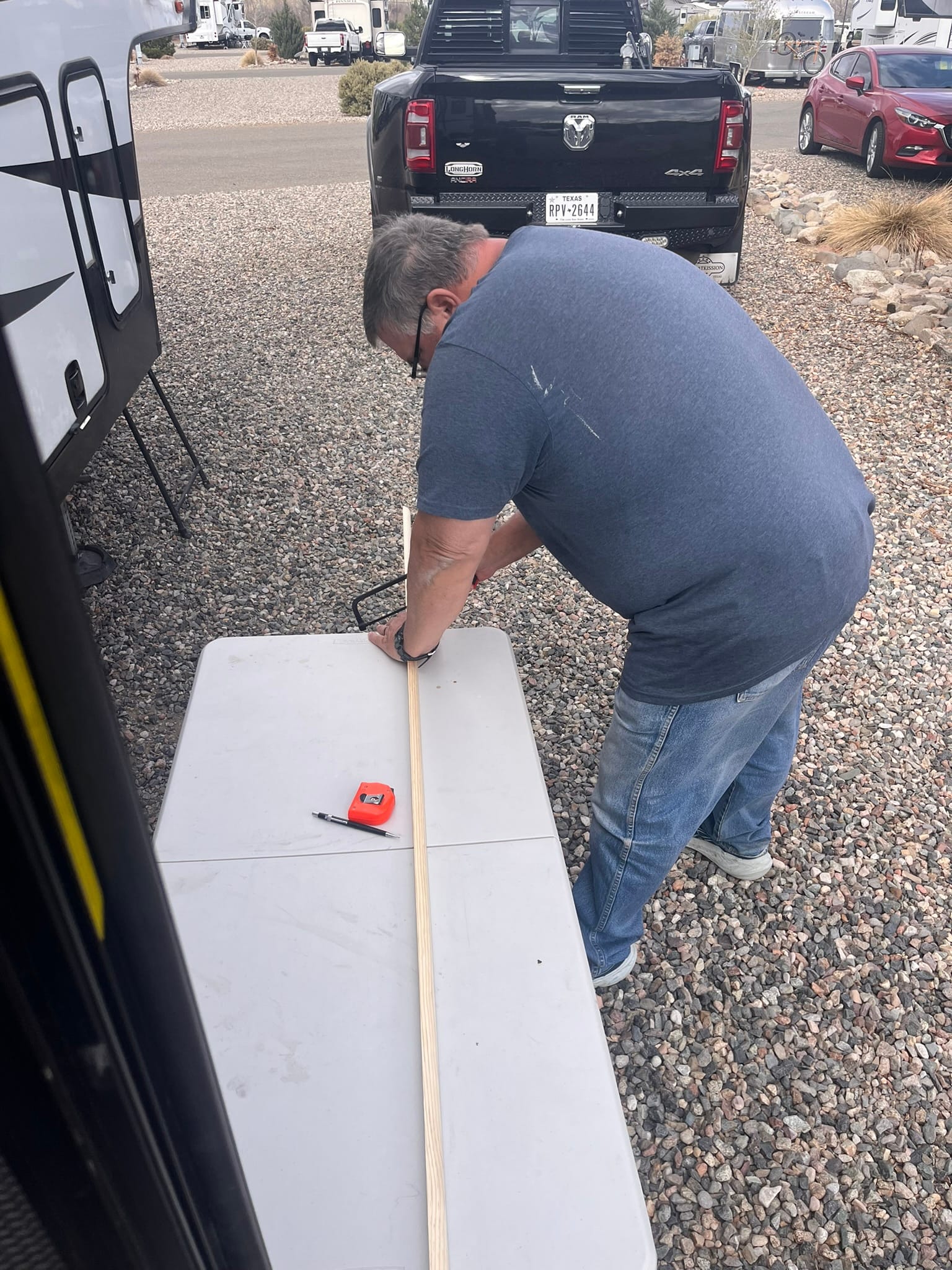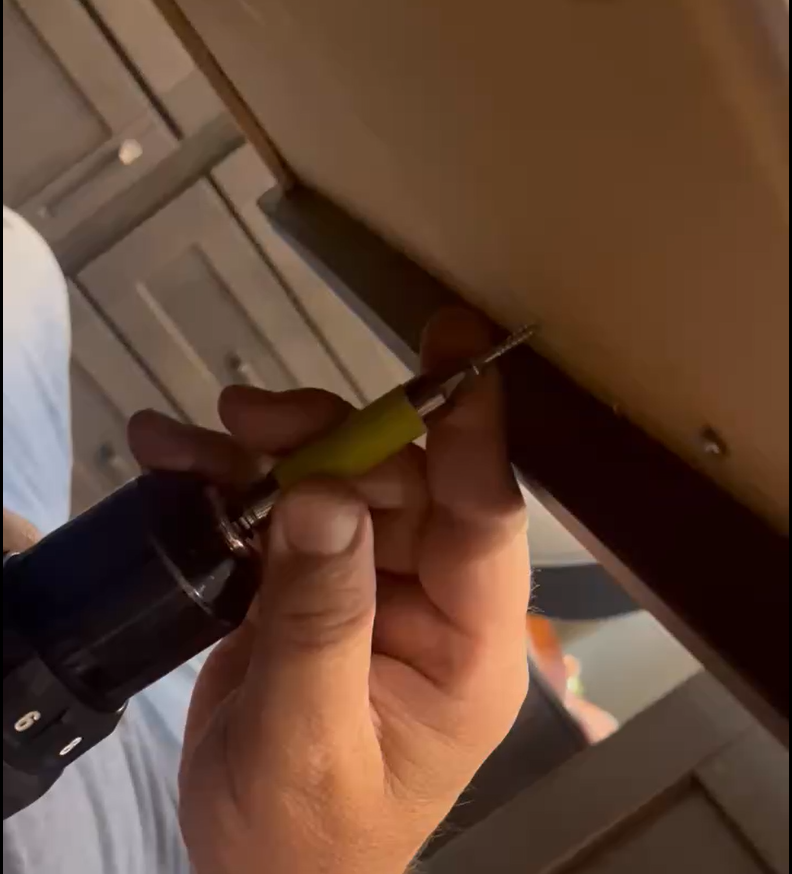 The drawer bottom is slid into grooves along the sides of the drawer frame and then the front and back are just held in place with short little staples. The staples had pulled out allowing the thin bottom wood to bend enough to escape the grooves. (Come on Grand Design, you can do better!) First, I pulled the staples up so the wood would go back into place. Then I had to gently bend the wooden bottom to get it back into the grooves and then I could drive the staples back into place. Clearly, the staples don't provide enough support on the front and back of the drawer to keep the bottom in place. I'm thinking about adding some quarter round trim along the inside of the front and back which I can attach with screws up from the bottom and through the sides to give it more support. I could put some along the sides as well for additional stability and maybe, if I'm lucky, use screws through the rails so the rails have more support.