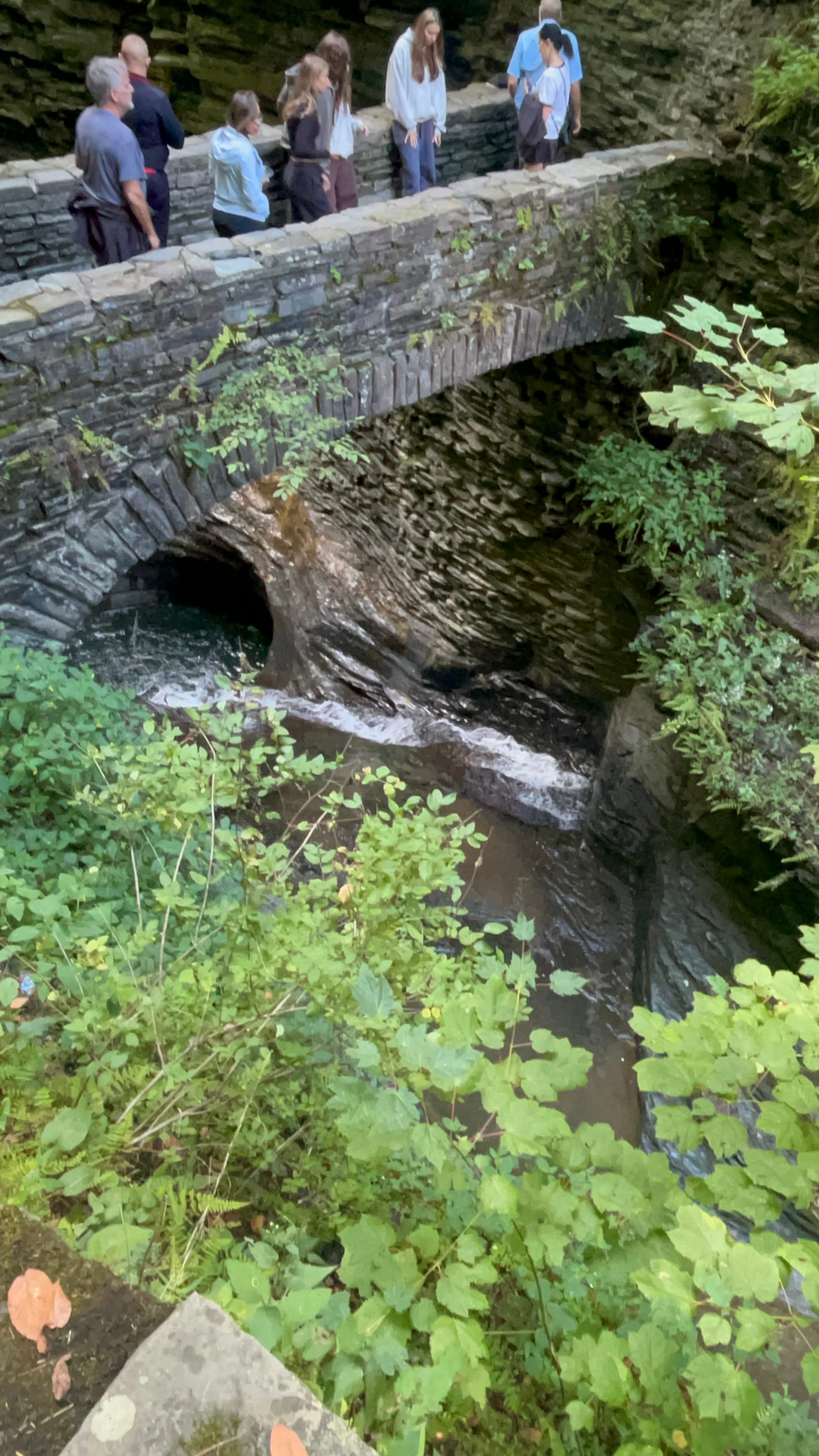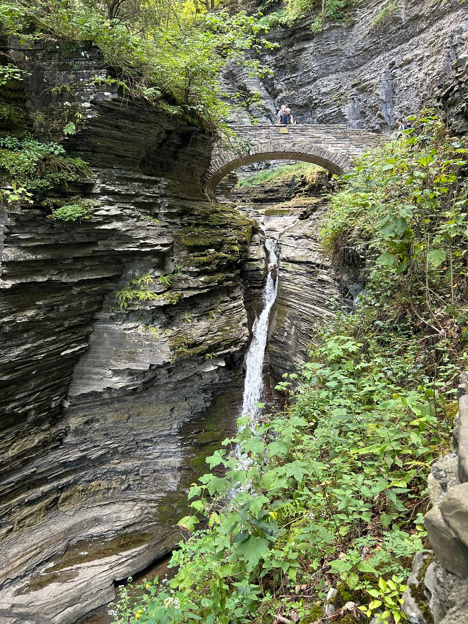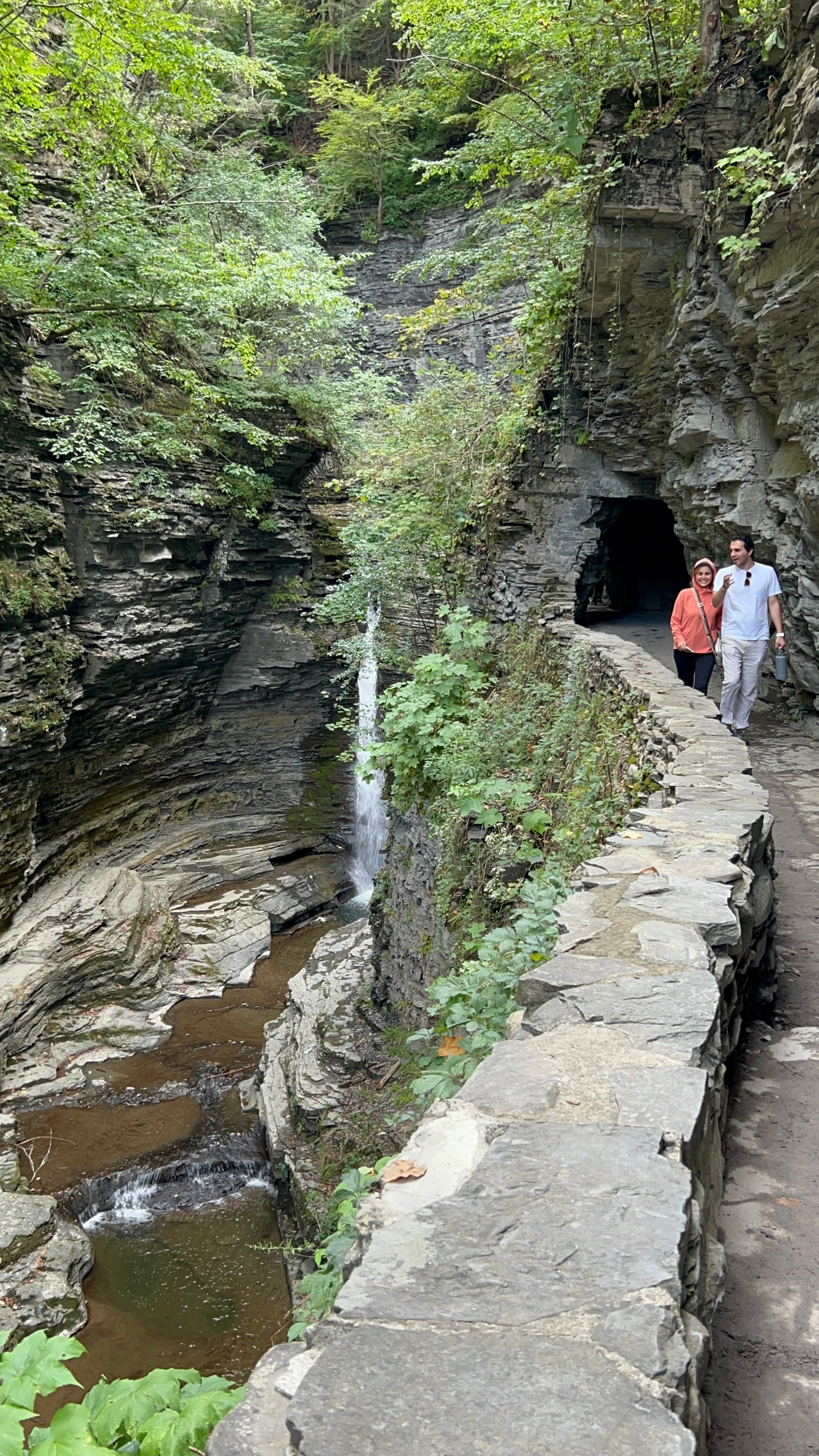 We walked the Gorge Trail from the Upper Entrance which is reached by descending a Jacobs Ladder of switchback steps down to the rivers level and then followed the flow of the water through the steep narrow chasm it has cut over the millennia. Falls, too numerous to count, delight you at each turn. Cliff walls overhang your head in sections and there are two short tunnels through the walls where the chasm is too narrow for a trail. There's even water dropping off the steep cliffs creating their own curtain in a couple of areas! There are picturesque stone bridges along the way allowing the trail to switch sides of the river and giving hikers an unrestricted view down into the depths of the river's channel.