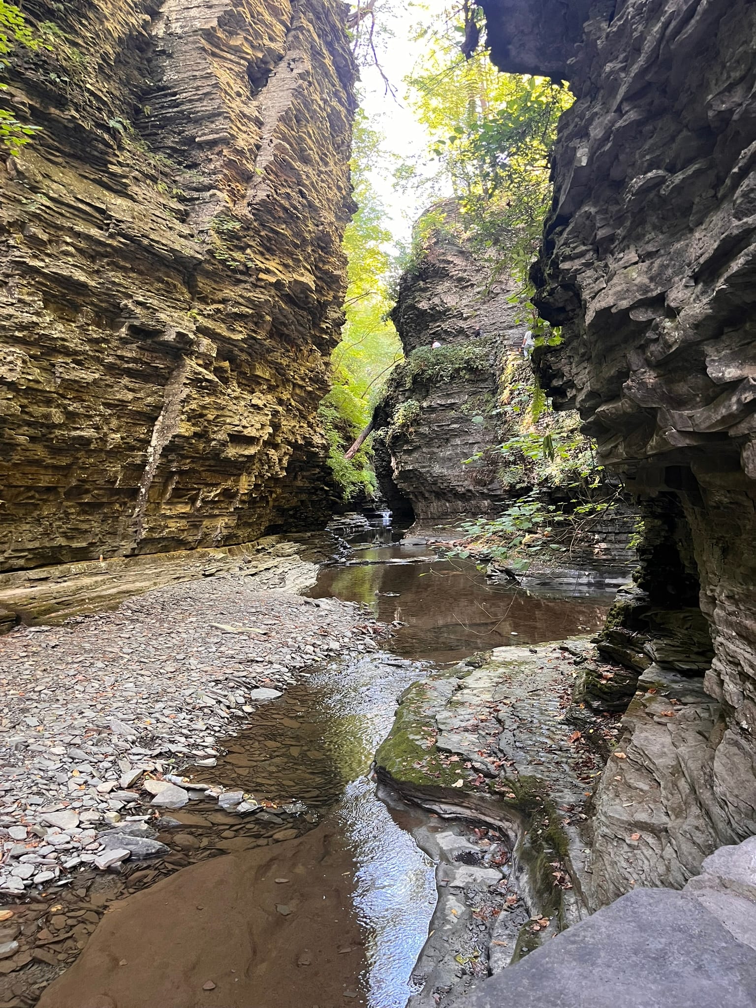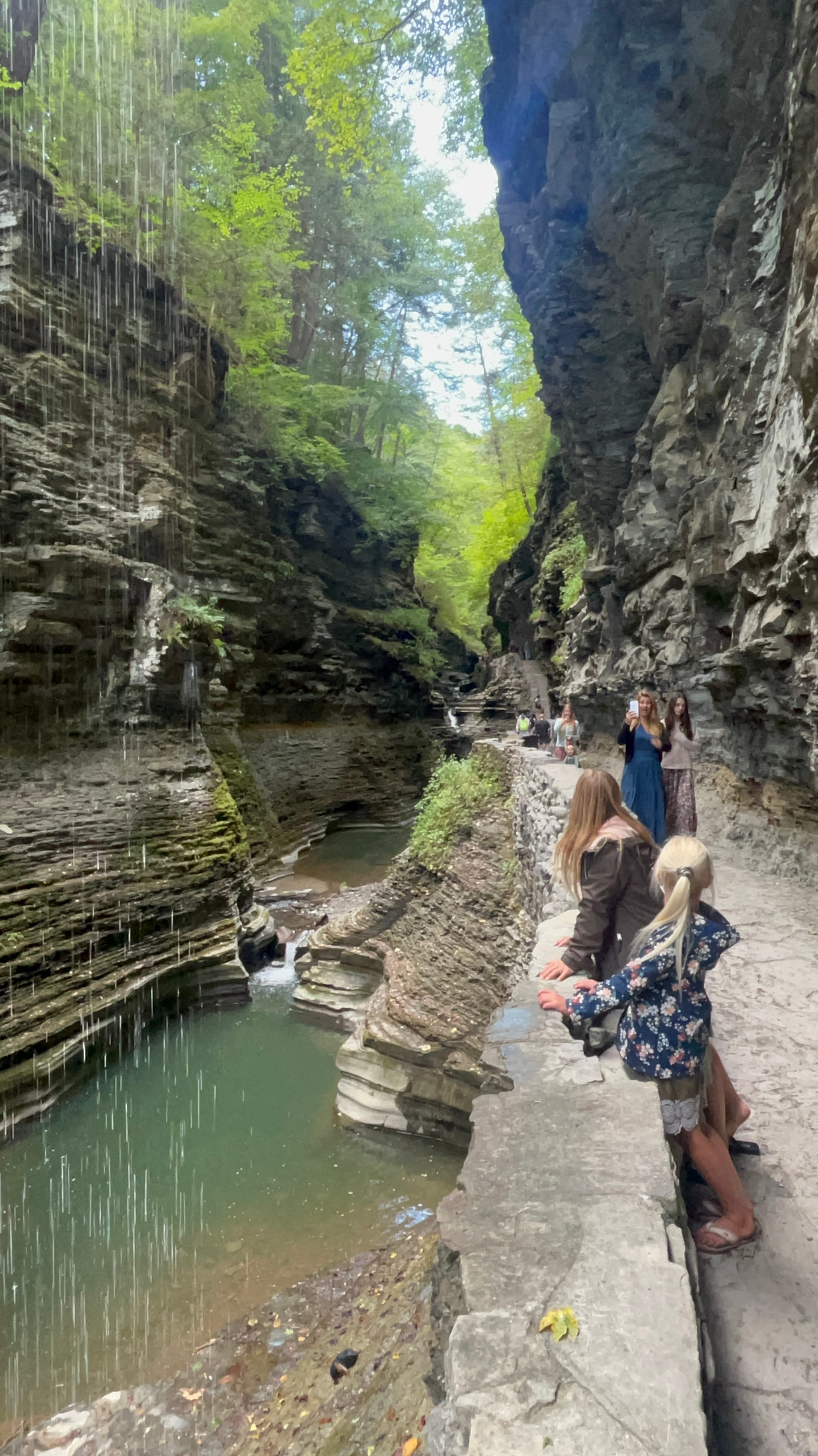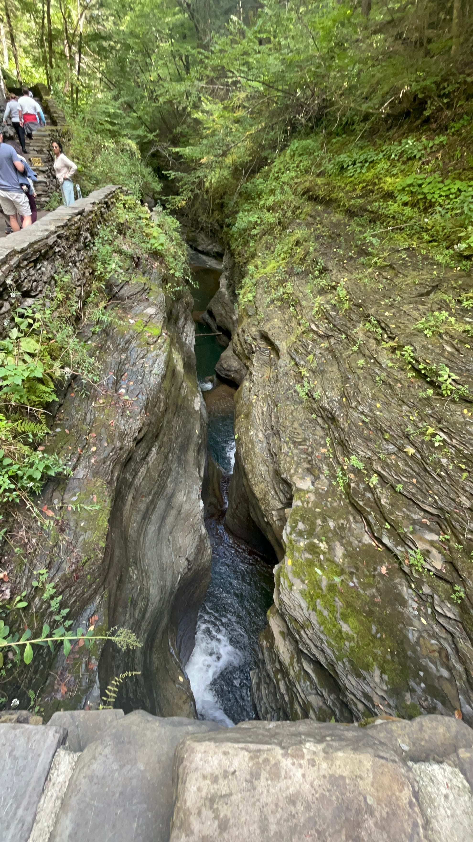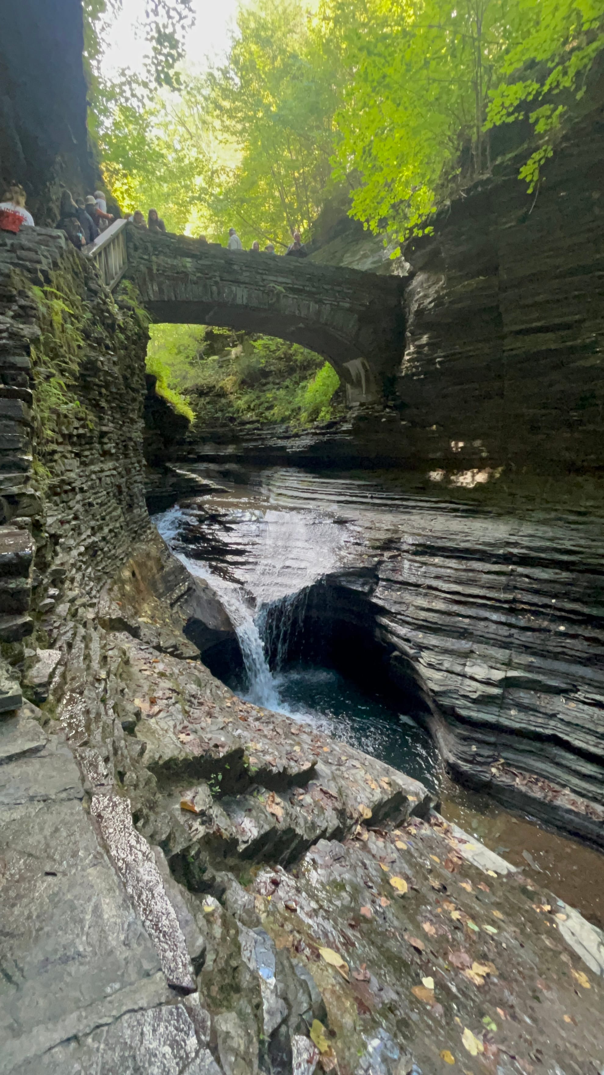 We walked the Gorge Trail from the Upper Entrance which is reached by descending a Jacobs Ladder of switchback steps down to the rivers level and then followed the flow of the water through the steep narrow chasm it has cut over the millennia. Falls, too numerous to count, delight you at each turn. Cliff walls overhang your head in sections and there are two short tunnels through the walls where the chasm is too narrow for a trail. There's even water dropping off the steep cliffs creating their own curtain in a couple of areas! There are picturesque stone bridges along the way allowing the trail to switch sides of the river and giving hikers an unrestricted view down into the depths of the river's channel.